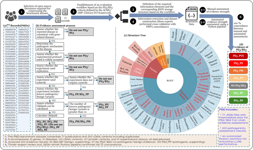 简介:美国医学遗传学与基因组学学会(ACMG)指南中的 PS3(致病性功能证据)与BS3(良性功能证据)标准是基因变异分类的关键依据。然而,人工评估耗时且易产生实验室之间的差异,显著限制了对“临床意义未明变异”(VUS)的解读效率。大语言模型(LLMs)为自动化评估提供了可能,但其性能验证因缺乏标准化、高质量数据集而受阻。本研究发布首个全链路人工标注的“PS3/BS3 证据基准数据集”(PBD),收录 77 篇同行评议文献,涵盖 266 条 cDNA 变异(含重复)及其 PS3/BS3 评级结果。数据集严格遵循 ClinGen 序列变异解读工作组(SVI)规范,提供覆盖基因-疾病-变异-实验-证据评级的结构化证据链,用于系统评价 LLM 在功能证据抽取任务中的表现。并在 DeepSeek 系列模型(1.5 b/7 b/14 b)上的实验验证了 PBD 对自动化变异解读的促进潜力。PBD 为生物信息学与精准医学研究提供了关键资源,有利于变异分类工具的标准化与性能提升。