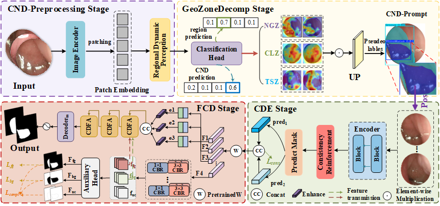 简介:变应性鼻炎(Allergic Rhinitis, AR)影响着全球超过5亿人口,亟需客观的影像员工物标志物以实现精准评估。作为AR的重要指标,清亮性鼻分泌物(CND)在鼻内镜图像中呈现出显著的视觉异质性与解剖学分布差异,使其分割任务极具挑战。这种困难主要源于复杂的光学伪影、柔性的解剖边界以及区域特异性的结构差异,严重制约了现有方法的性能。为此,本文提出了一种VRSegNet框架——一种基于视觉关系引导的分割方法,通过显式的解剖结构约束实现对CND的稳健定位。VRSegNet将鼻腔分解为三个功能区——中央腔隙区(CLZ)、鼻沟区(NGZ)和过渡沟区( TSZ),以适应结构和形态的变化。该框架结合视觉关系引导的对比学习(VR-CL)与动态区域感知融合机制,在复杂共现与模糊边界条件下有效区分分泌物与周围组织。基于 RhinoDynamix 数据集的大量实验表明,区域特异性分析显示分割结果与变应性鼻炎严重程度分级具有显著相关性,凸显了该框架在临床辅助评估中的潜在价值。