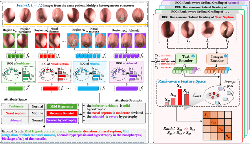 简介:鼻内镜检查是诊断上呼吸道疾病(如腺样体肥大和鼻中隔偏曲)的关键手段。然而,现有的鼻内镜图像分级方法往往难以解决解剖结构描述与影像特征之间的差异,从而导致严重程度评估不准确。这一挑战在处理高度相似复杂结构时尤为明显,可能引发视觉错觉并干扰准确分级。为此,我们提出ARAG方法,这是一种用于鼻内镜严重程度评估的新方法。通过采用上下文感知、区域特定的方式独立处理各解剖区域(如下鼻甲、鼻中隔、腺样体),从而提升分级准确性。该方法通过基于属性的提示消除结构间干扰,并改善视觉特征与临床描述的对齐。此外,采用等级感知顺序损失确保不同区域间严重程度递进关系的准确性。在多数据集上的广泛评估表明,本方法各项指标均持续优于基线模型,该框架不仅提升了分级准确性,更为临床实践中不同鼻部结构的严重程度评估引入了新方法,在改善诊断和治疗决策方面具有重要潜力。